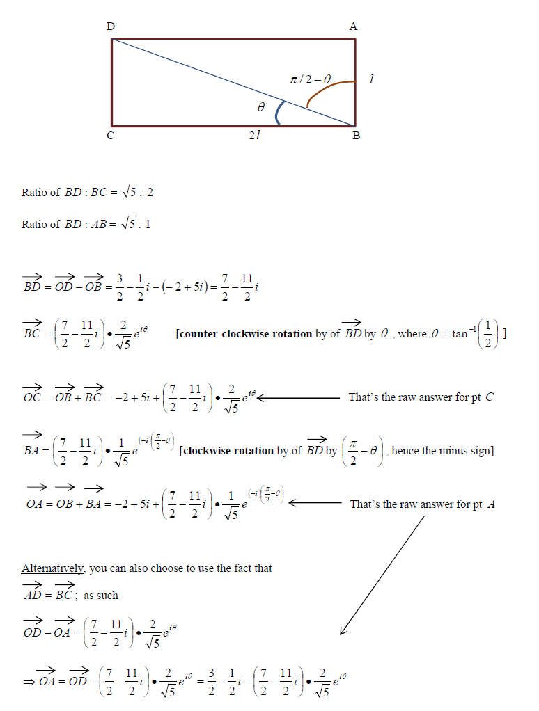 How do I do this question- In an Argand diagram, the points A, B, C and D represent the complex numbers a, -2+5i, c and 3/2 - 1/2 i respectively. Given that ABCD is a rectangle described in the clockwise sense with BC=2AB, find a and c.